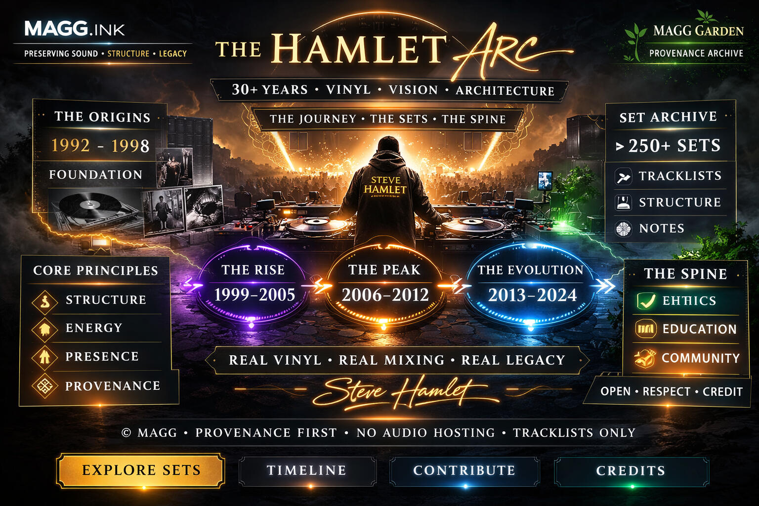 Some never stop.Inspired by a DJ who has never stopped, built on MAGG™ Frameworks.From late-90s West Country underground nights to modern vinyl-only events, his presence isn’t a moment — it’s a line running through decades of dancefloor history.The Hamlet Arc is not a story.